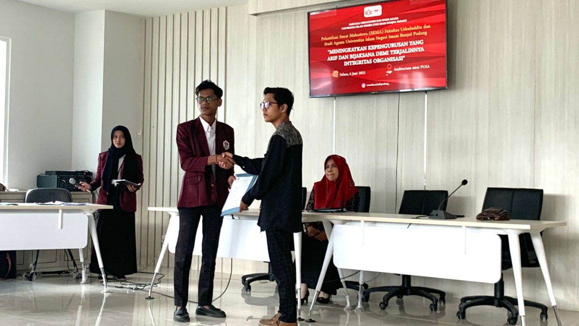 Suarakampus.com– 27 pengurus Senat Mahasiswa (Sema) Fakultas Ushuludin dan Studi Agama UIN IB Padang, ikuti pelantikan periode 2023. Kegiatan tersebut berlangsung di Aula FUSA, Selasa (06/06).