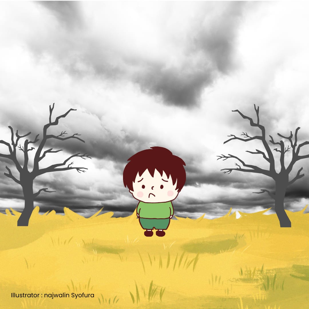 Ilustrasi menampilkan seorang laki-laki berdiri sendiri di tengah padang rumput, dengan langit gelap dan pohon mati di sampingnya, menggambarkan penantian yang tak berbalas dan kesunyian. Sumber : Najwalin Syofura.