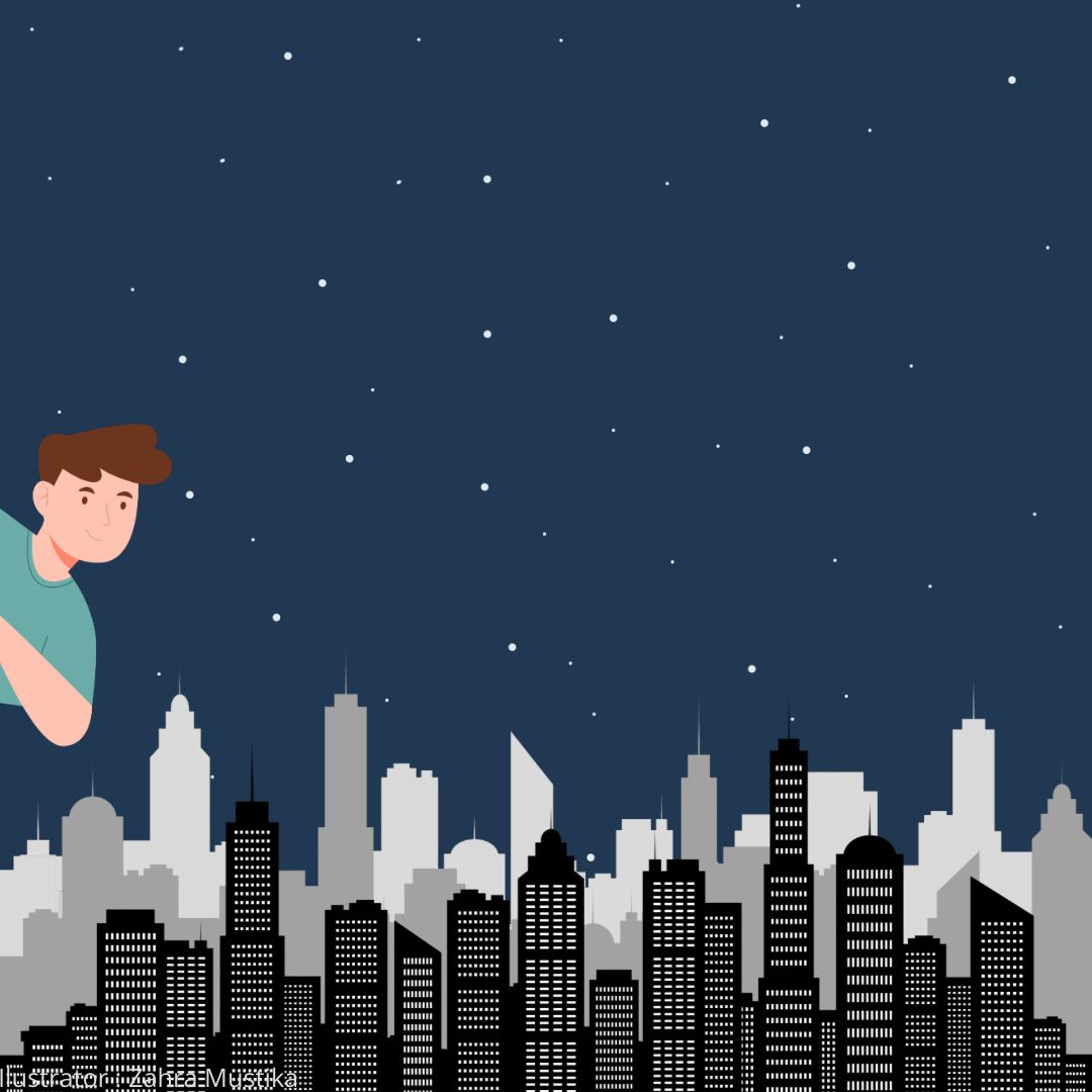 Ilustrasi menampilkan seorang sosok yang memandang langit malam di tengah kota, menggambarkan dialog sunyi manusia dan bintang. Sumber : Zahra Mustika