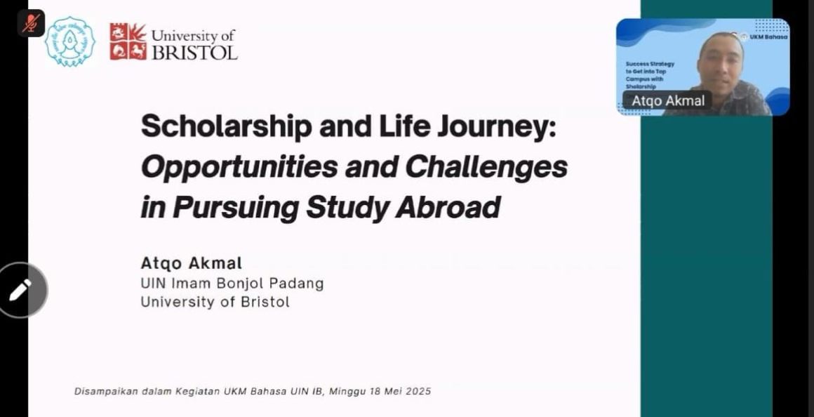 Suarakampus.com – Unit Kegiatan Mahasiswa (UKM) Bahasa UIN Imam Bonjol Padang menggelar webinar internasional bertema “Apply Scholarship to Study Abroad” . Webinar ini membahas #kaburajadulu yang mengudara dimedia sosial, pada Minggu (18/5).