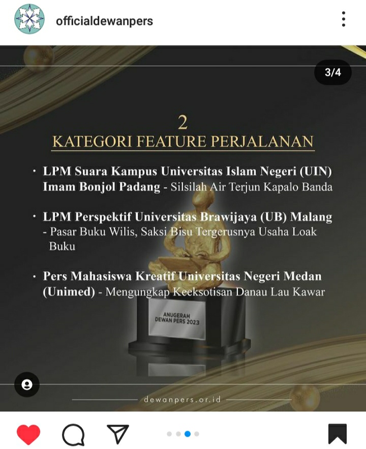Suarakampus.com– Lembaga Pers Mahasiswa (LPM) Suara Kampus UIN Imam Bonjol Padang berhasil masuk nominasi kompetisi Karya Jurnalistik Pers Mahasiswa dalam ajang Anugerah Dewan Pers 2023. Dengan membawa karya berjudul “Silsilah Air Terjun Kapalo Banda” pada kategori feature perjalanan.