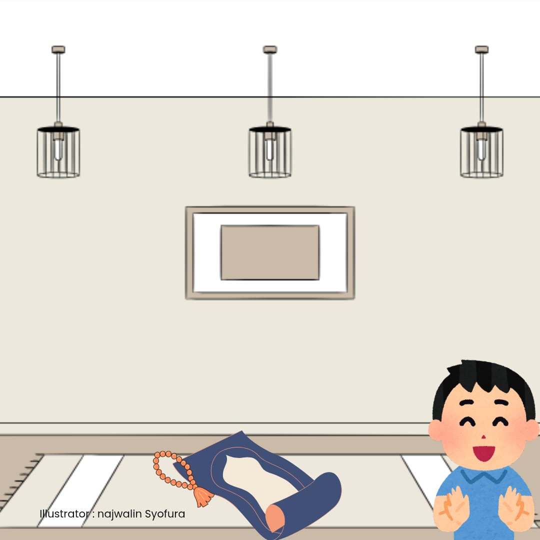 Ilustrasi seorang anak di dalam masjid dengan sajadah di hadapannya, menggambarkan ketulusan ibadah dan pengabdian seorang ayah. Sumber : Najwalin Syofura.
