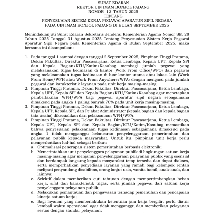 Rektor UIN Imam Bonjol, Martin Kustati, menerbitkan kebijakan ini sebagai tindak lanjut dari Surat Edaran Sekretaris Jenderal Kementerian Agama Nomor SE.28 Tahun 2025. Aturan tersebut menekankan pentingnya menjaga layanan publik tanpa mengabaikan efektivitas kerja ASN.